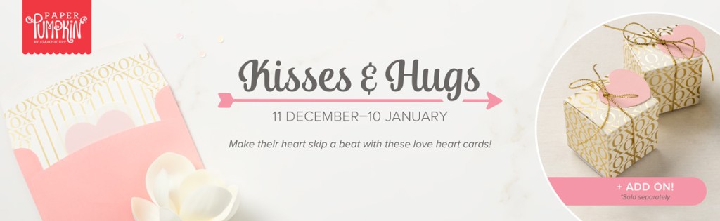 You’ll also be able to purchase a coordinating add-on – the Kisses & Hugs Mini Treat Boxes, Item No. 160147, for $10. You’ll receive 20 mini treat boxes (1-3/4″ x 1-3/4″ x 1-3/4″), gold cord and the boxes are printed with gold foil. Who wouldn’t want to receive one of these special boxes? To purchase this add-on, you must be a Paper Pumpkin subscriber and the add-on can be purchased beginning on January 25. Don’t wait until the last minute to order as supplies may be limited!
