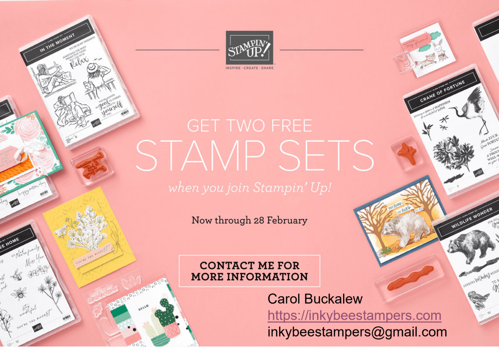 If you decide to sign up as a Stampin’ Up! demonstrator during Sale-A-Bration, you will receive two free stamp sets after picking all of the products you want in your Starter Kit. The stamp sets need to be live at the time of picking them, so anything you see in a current catalog or at stampinup.com is eligible.  Please visit Join My Team page if you’d like to become a Demonstrator on my Team.