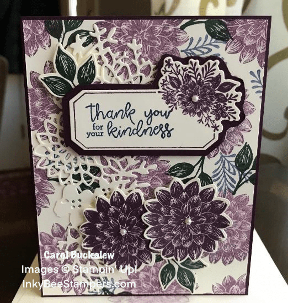 Today’s card was made using the Dahlia Days Stamp Set and Detailed Dahlias Dies. I had a Dahlia in the garden this summer that was this exact shade – a deep, rich purplish-pink. Is that a color? In the case of this card, the color is Blackberry Bliss! There is no instruction sheet today as the directions are pretty straight forward.