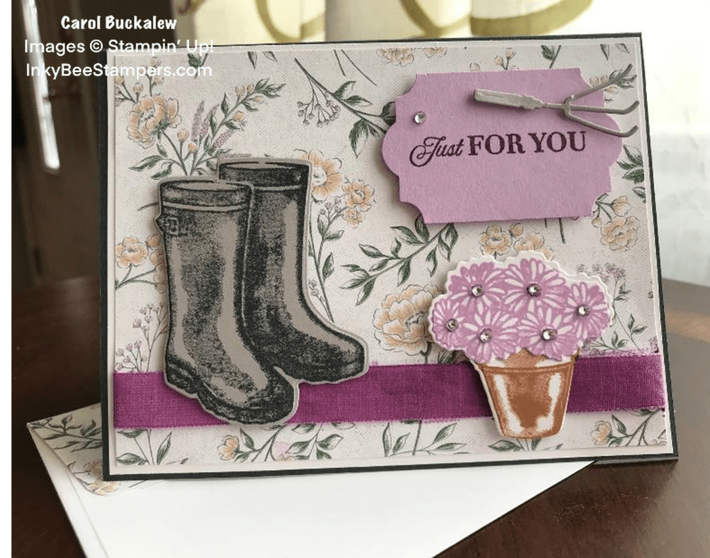 The card base was cut from a piece of Evening Evergreen Cardstock. The front of the card includes a white mat underneath the Heart & Home DSP and white ribbon which I colored with Fresh Fresia ink. Boots, a pot of flowers, rake and a sentiment finish off this card. You can find instructions and a supply list for this card by clicking on the image below.