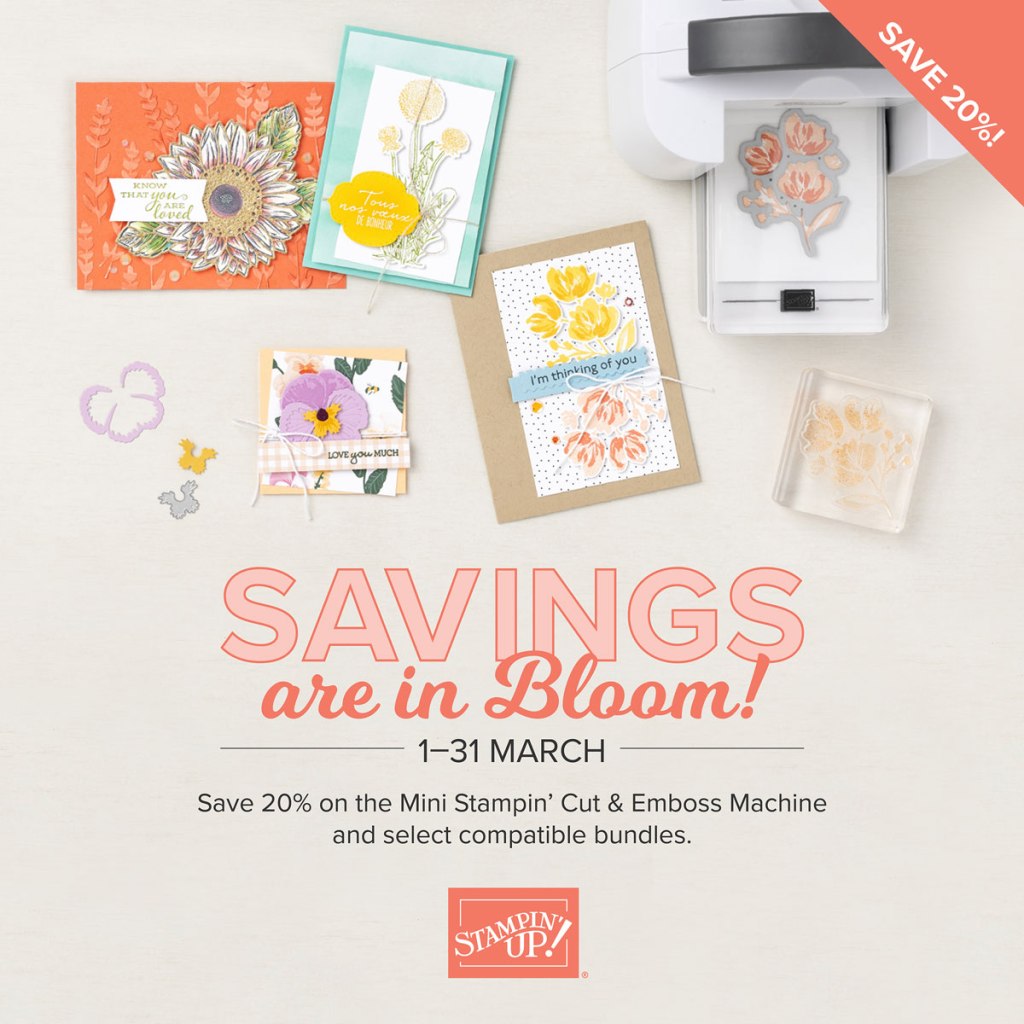 Spring has sprung—and so have savings! During the month of March, save 20% on the Mini Stampin’ Cut & Emboss Machine and select compatible stamp-and-die bundles. This promotion will run from March 1 to March 31, 2022. The Mini Stampin’ Cut & Emboss Machine and select compatible bundles can be bought together or separately.