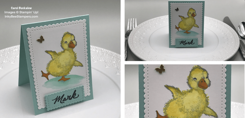 The place setting card measures only 4″ x 2-3/4″ when folded. I used the Easter Friends stamp set for the duck image and the Stitched So Sweetly dies to cut out the white panel and the name tag. These panels sit on a Pool Party card base. The duck image was stamped in Smokey Slate. I used a blender pen to color in the duck with Daffodil Delight and Pumpkin Pie. Stampin’ Blends were used to color in the puddle. A Brushed Brass Butterfly was added to the white panel to finish the place card.