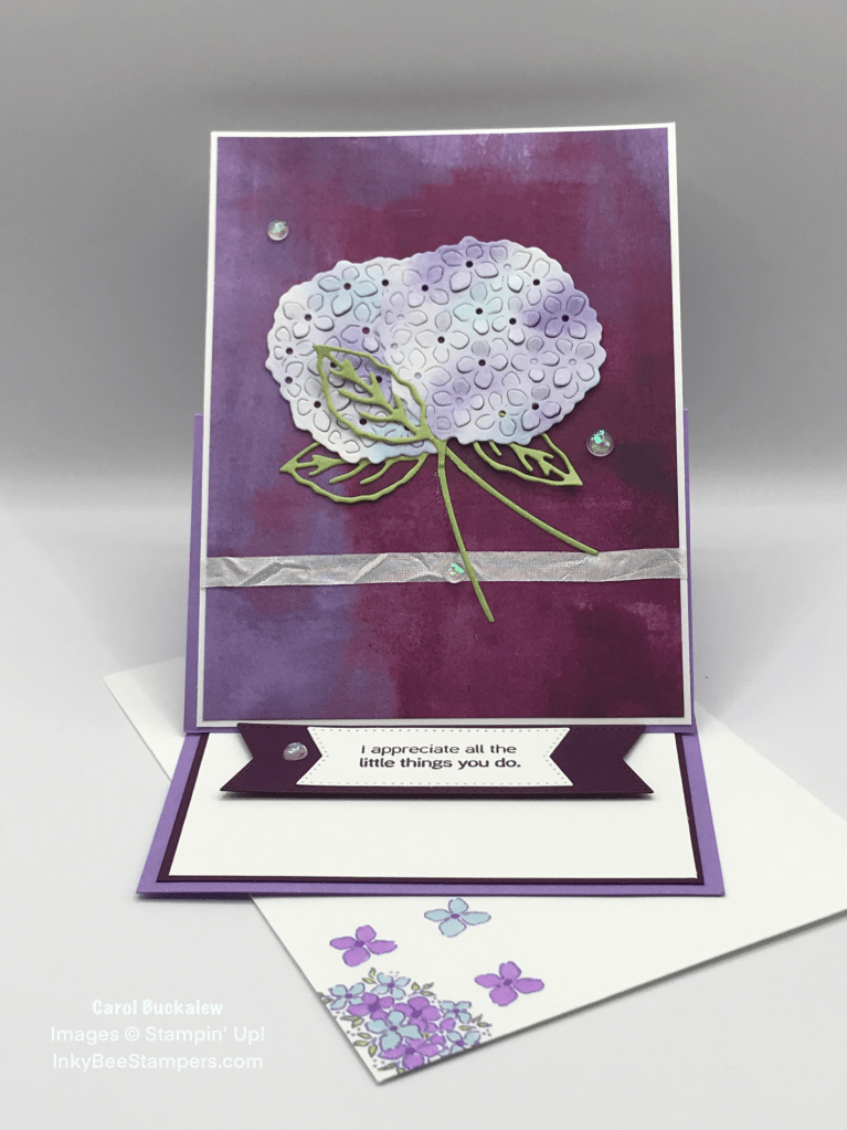 Today’s card uses the Hydrangea Haven Bundle. The die cut hydrangeas are set against the beautiful Flowering Fields DSP on this easel card. I CASE’d this card fold from my teammate, Rose Kean. Thank you, Rosie!