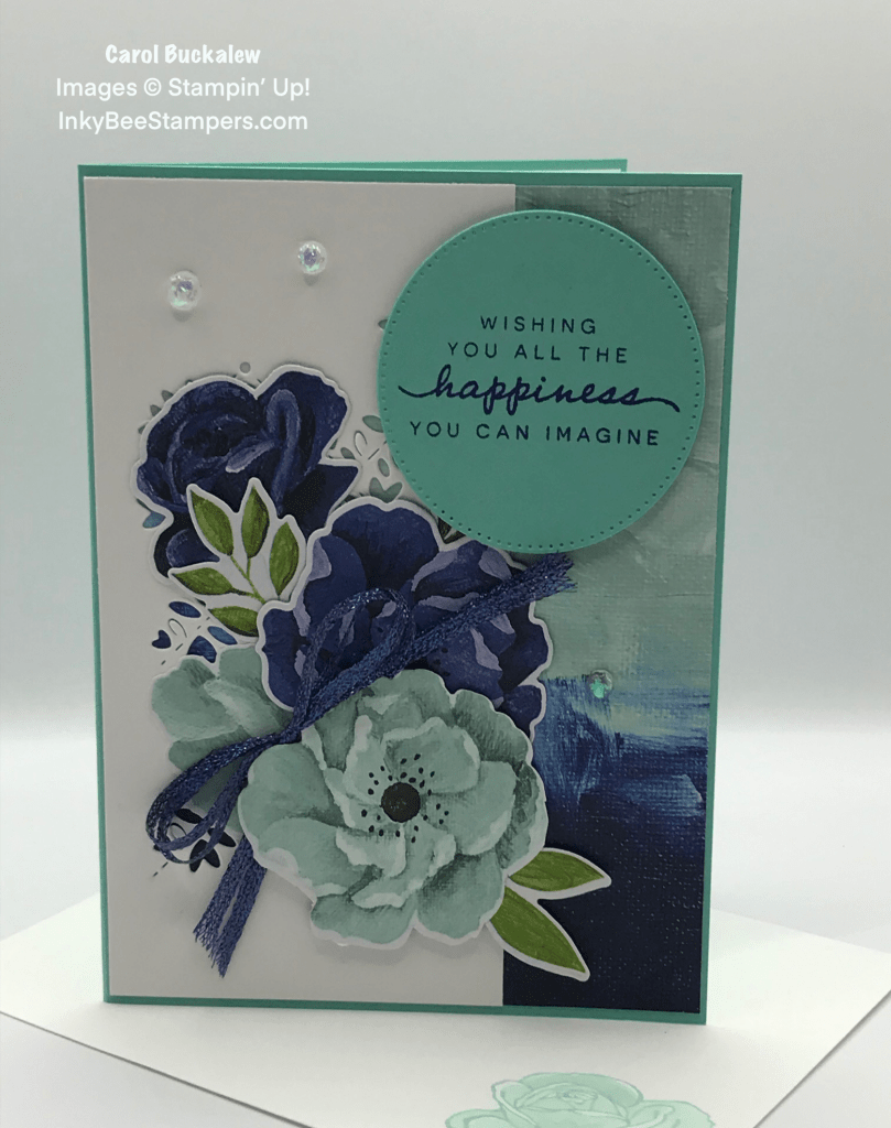 The beautiful roses on this card, as well as the background DSP come from the Hues of Happiness 12″ x 12″ Designer Series Paper. The dies from the Happiness Abounds Bundle include dies that will cut out the rose and leaf images on the DSP! How cool is that?