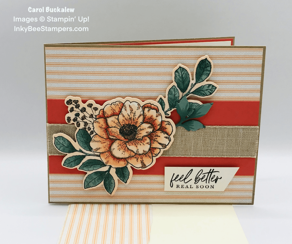 Several of the images from the collection were stamped, die cut and colored using Stampin’ Blends. I then used a piece of DSP from the Abigail Rose 12″ x 12″ Designer Series Paper pack as the card background and added a strip of Calypso Coral over the DSP. Calypso Coral is not one of the “coordinating” colors with this DSP, but I think it’s a great compliment to the Petal Pink in the DSP. I added a small sentiment and some of the new Natural Finish Ribbon to complete the card.