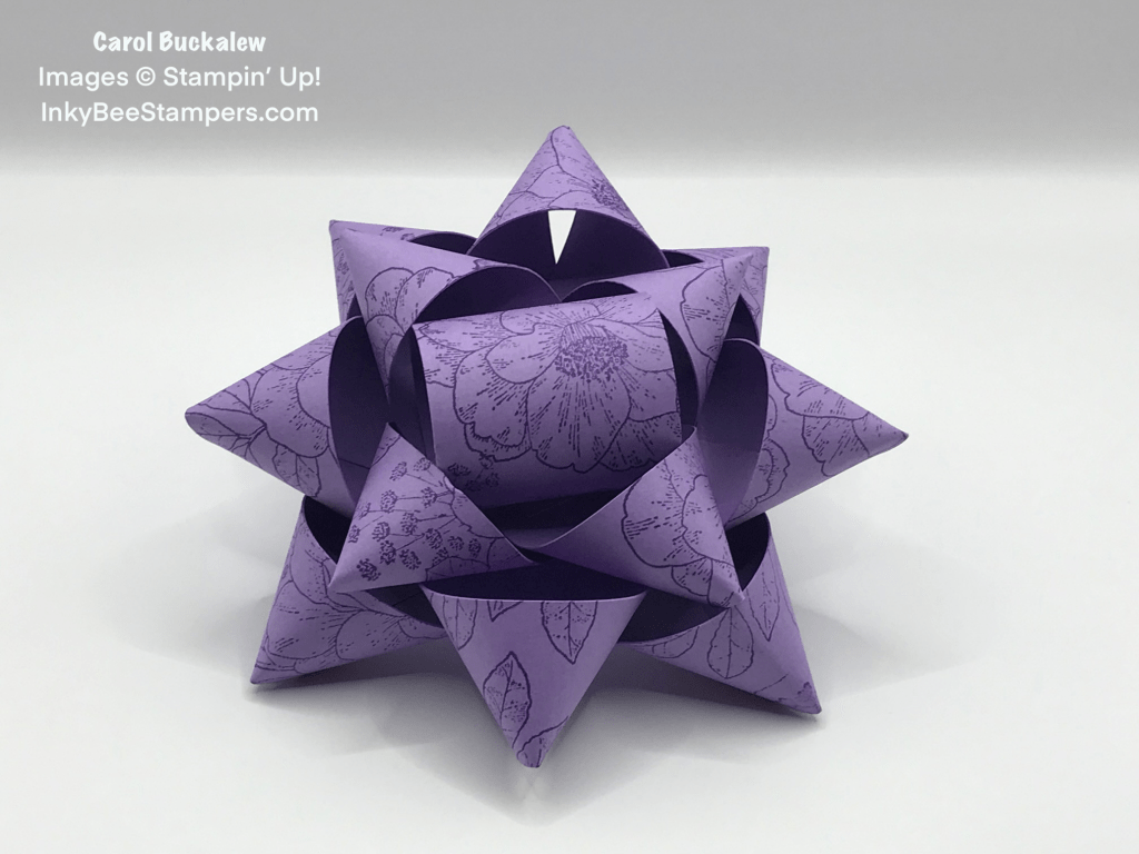 You can make a regular sized bow from one sheet of 6″ x 12″ DSP, or one sheet of 8-1/2″ x 11″ cardstock with very little waste and using minimal supplies. I also made a bow from cardstock. I selected a pretty flower stamp from the Happiness Abounds stamp set and stamped repeatedly in Gorgeous Grape onto a piece of Highland Heather cardstock – tone on tone. I also experimented with the circle section of the center of the bow and cut this center strip slightly longer and wider for a different look. I love how both bows turned out. What do you think?