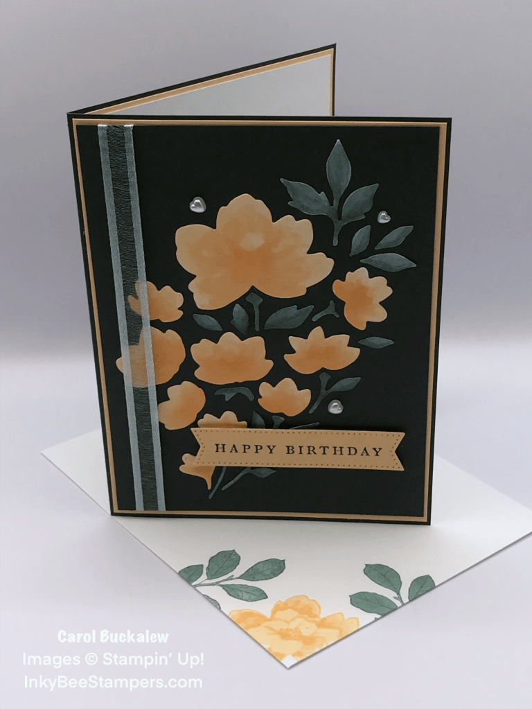 Each of the flowers, stems and leaves were colored using Stampin’ Blends. On the flowers, I used the darker shade of Pale Papaya to give the suggestion of the rose “bowl” and petal edges for a soft look. A sentiment stamped in Evening Evergreen on a Pale Papaya label was added, along with a strip of Soft Succulent Open Weave Ribbon and a few Heart Pearls…giving this card a romantic look.