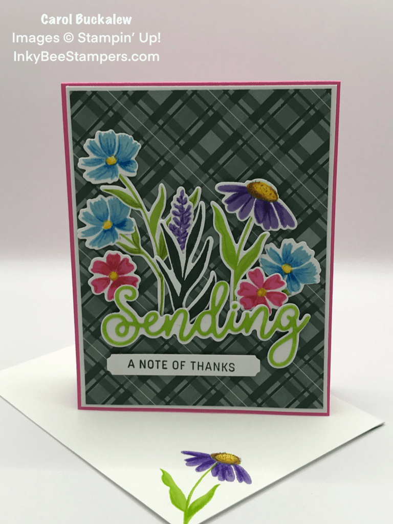 I paired the Polished Pink card base with a piece of Evening Evergreen paper from the 2021-2023 In Color DSP. Stamped and die cut flowers, leaves and sentiment were added to the card front to resemble a flower bed. Such happy flowers in the Sending Smiles set!