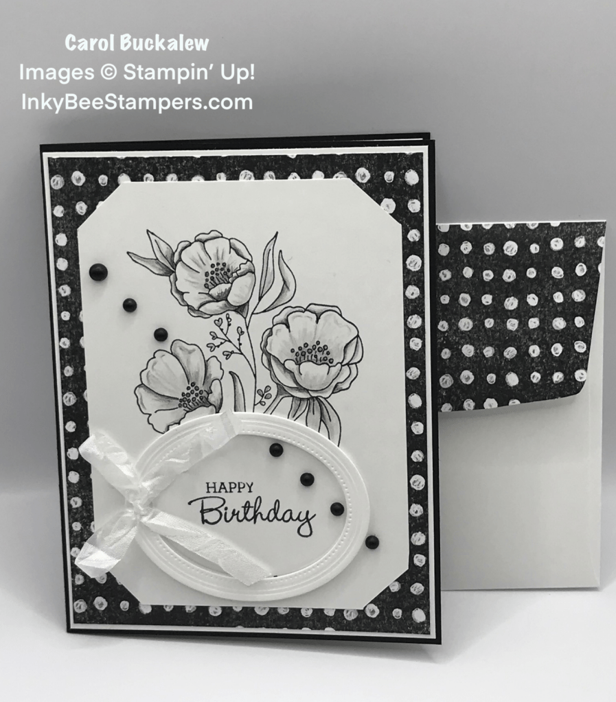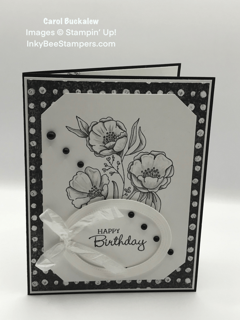 The theme for today’s Blog Hop is “Birthday”. My card for today’s Hop was created using the Fresh Cut Flowers stamp set, and the beautiful Perfectly Penciled 12″ x 12″ Designer Series Paper in classic black and white. I selected a sentiment from the Pansy Patch stamp set which is highlighted by an oval frame from the Fabulous Frames Dies. Card details, including measurements, can be found on the project sheet which is linked towards the bottom of this post.