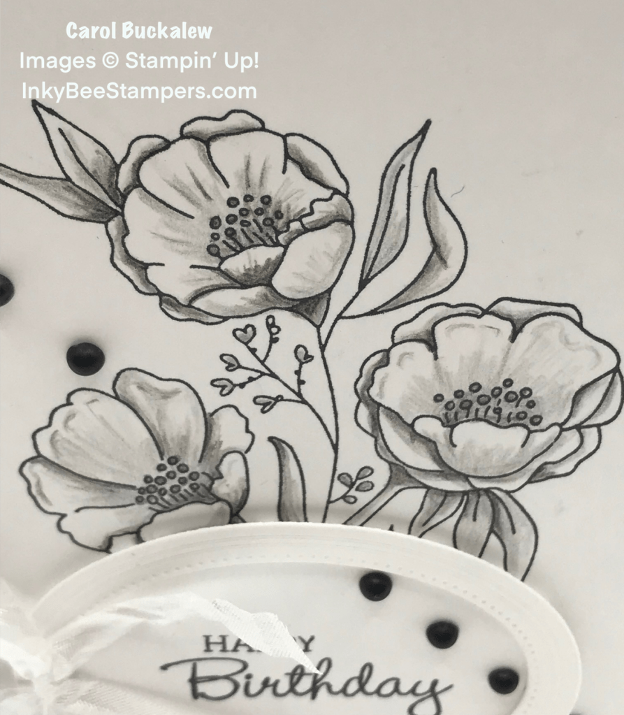 A second Basic White panel was used for stamping the flower image from the Fresh Cut Flowers stamp set. The four corners of the panel were cut to reveal more of the gorgeous designer series paper. The flower image was shaded using Stampin’ Up! Watercolor Pencils in Basic Black and Basic Gray to provide a little dimension to the image. I then adhered this panel to the card front.