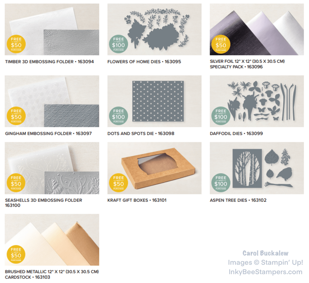 Stampin’ Up! has added some additional items that you can earn for free during Sale-A-Bration…that’s exciting news! Place a $50+ or $100+ order between now and August 31 to earn one of these new items, or any of the items already included in the Sale-A-Bration brochure. Please note that the Pool Party & Soft Sea Foam Cards & Envelopes and the Tree Lot Dies Sale-A-Bration items are no longer available.
