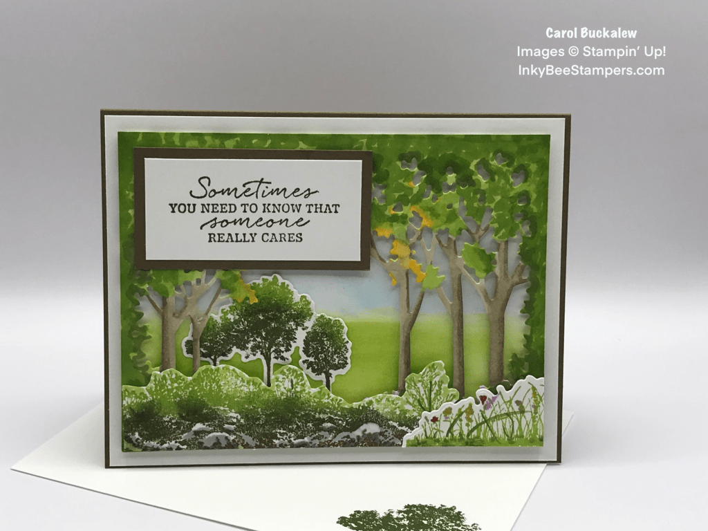 For the tree frame die cut I used blending brushes again to color the entire frame in Daffodil Delight ink, then came back with Mossy Meadow to blend a little green onto the die cut frame for the leaves on the trees. Crushed Curry was also blended in spots to darken the tree canopy. A Stampin’ Blend was used on the frame to darken some of the leaves in Cajun Craze then I blended this out a bit with a Daffodil Delight Stampin’ Blend. The tree trunks were colored in using Crumb Cake Stampin’ Blends. The die cut tree frame was adhered to the background panel using Stampin’ Dimensionals, then this unit was adhered to a Mossy Meadow mat and adhered to the card front with liquid glue.