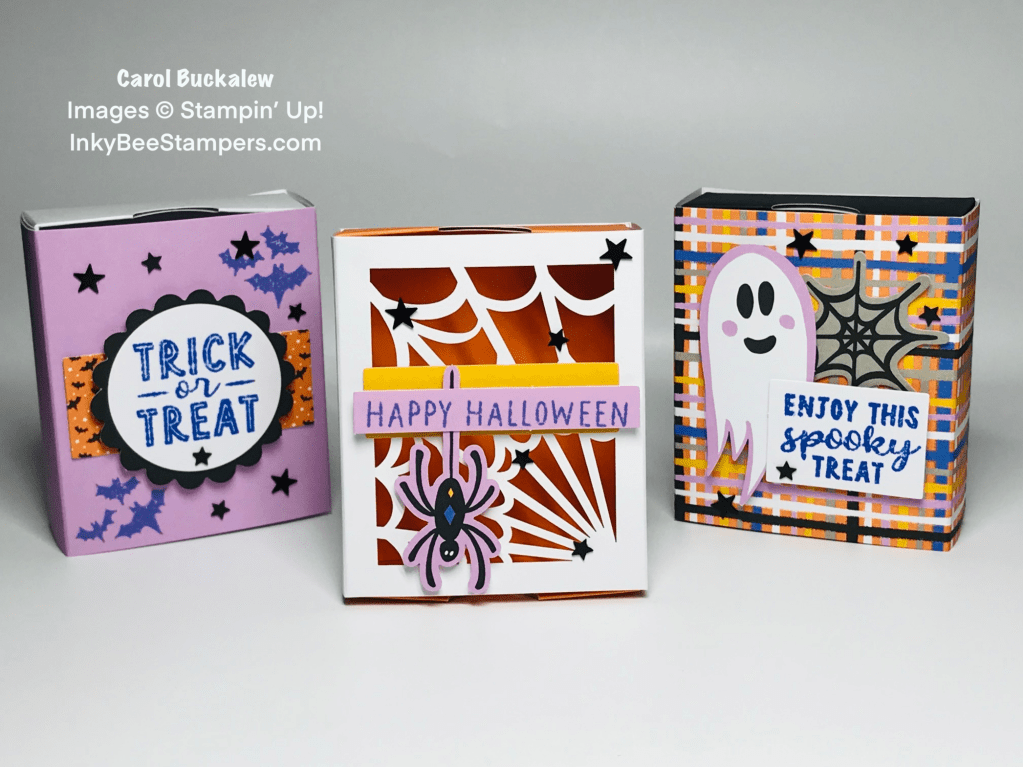 The Spooky Treats Paper Pumpkin Kit arrived with everything needed to create these adorable boxes and came with enough supplies to create a total of 18 boxes – 3 of each design. The boxes are big enough to fit two fun-size candy bars (I checked :)), so they are a generous size! And they were so much fun to put together!
