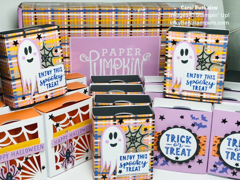 What’s more fun than creating your own Halloween treat box? Why, creating 18 fun Halloween treat boxes, of course! I received my September Paper Pumpkin kit in the mail this week and I couldn’t wait to assemble the cute Spooky Treats boxes!