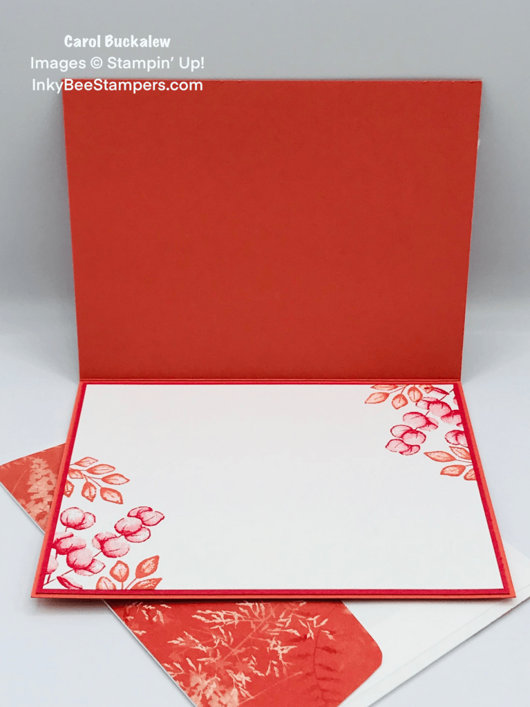 The berry image from the Forever Fern Stamp Set as well as the leaf image were stamped on the inside panel and this panel was adhered to a mat in Sweet Sorbet, and then adhered to the inside of the card. The leaf and berry images were also stamped onto the envelope front.