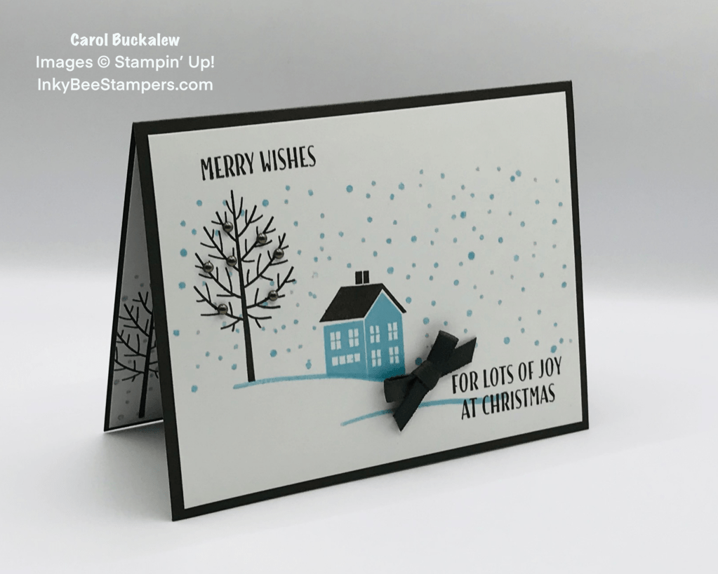 On a white panel, I stamped the two snow hills in Balmy Blue ink. The tree and sentiments were added to the panel using Early Espresso ink. I then stamped the house in blue and the roof in Early Espresso. I purposely left a gap between the house and roof to give the impression of trim on the house, but you can definitely line these stamps up to meet if you’d like. Snow was repeatedly stamped around the images using Balmy Blue ink.