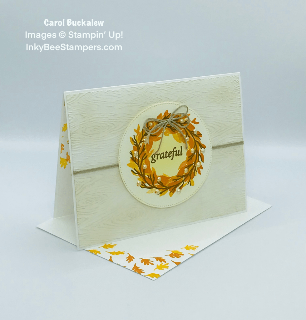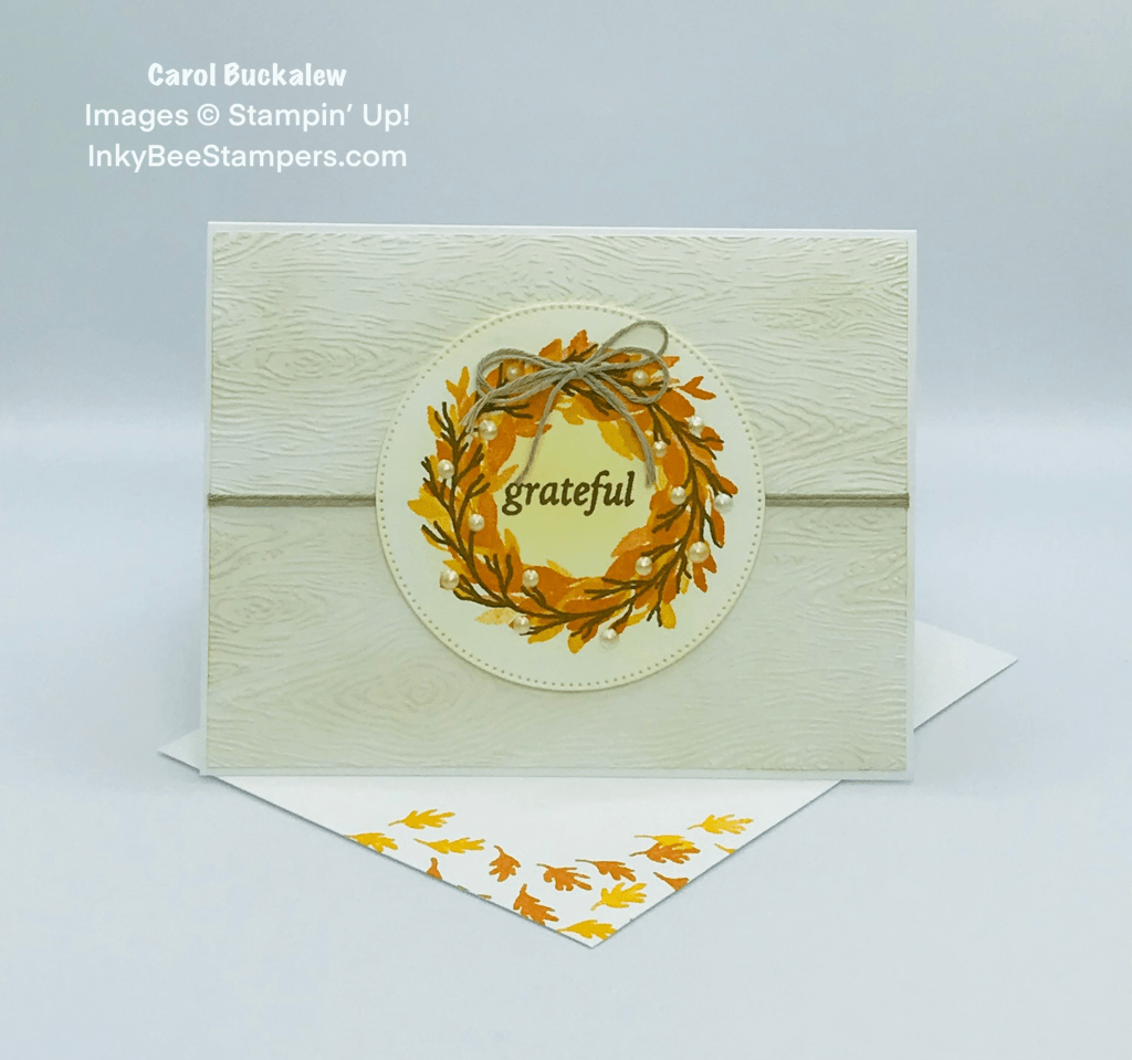 A circle was die cut using the Stylish Shapes Dies and So Saffron ink was blended across the die cut circle, concentrating the color towards the center of the circle. The wreath image was then stamped onto the circle – first in Mango Melody, and then Pumpkin Pie ink. The twig wreath was stamped over the previously stamped wreath using Soft Suede ink. The sentiment was added to the middle of the wreath also using Soft Suede ink. The circle was adhered to the card front using Stampin’ Dimensionals.