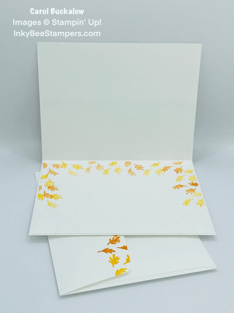 For the inside panel I repeatedly stamped the 3-leaf image from the Cottage Wreaths Stamp Set across the top and sides of the panel – alternating between Mango Melody and Pumpkin Pie ink. The envelope front and envelope flap were stamped with the same image in the same ink colors.