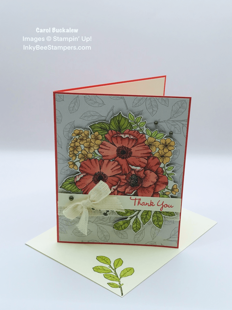 An additional sentiment was stamped in Calypso Coral ink on the inside panel. The leaf image from the Cottage Rose Stamp Set was stamped in Memento ink onto the lower portion of the panel and colored in using Old Olive Stampin’ Blends. The panel was then adhered to the inside of the card.