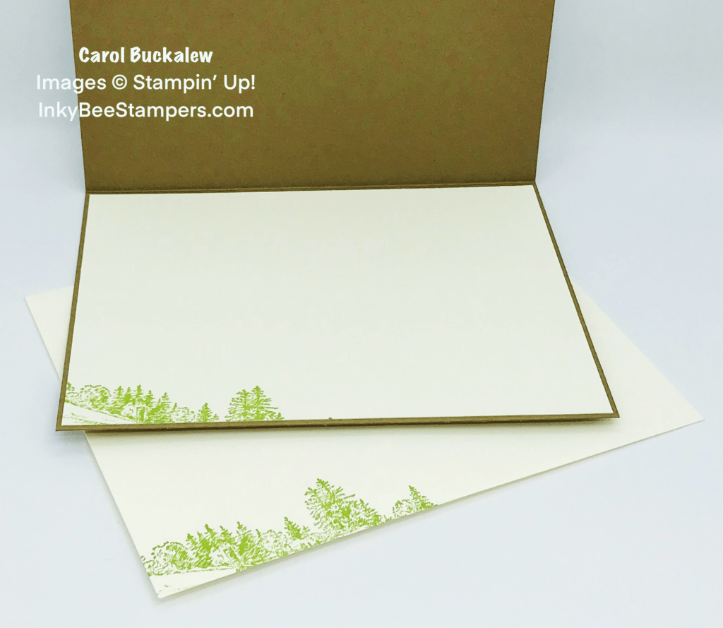 For the inside panel I used the same stamp from the In The Country Stamp Set and stamped only the tops of the trees along the bottom edge of the panel. The panel was then adhered to the inside of the card.