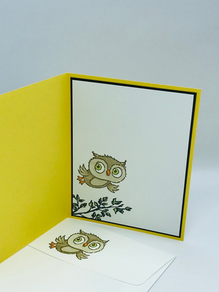 On the inside panel and envelope front, the tree branch was stamped using Memento ink as was the flying owl. I used Stampin’ Blends to color in the tree branch and owl. The inside panel was adhered to a black mat then adhered to the inside of the card.