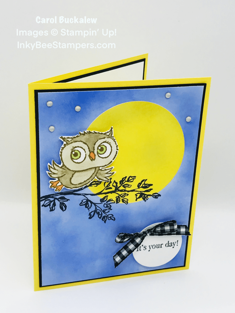 A sentiment from the Adorable Owls Stamp Set was stamped onto a scrap piece of white cardstock and I used the second to smallest circle die from the Layering Circles Dies set to cut out the sentiment. The sentiment was adhered to the card front using Stampin’ Dimensionals and was positioned on the lower right of the card. I added a small Black & White Gingham Ribbon bow just above the sentiment label and a few Adhesive-Backed Milky Dots were added around the moon (our night sky needed stars after all!).