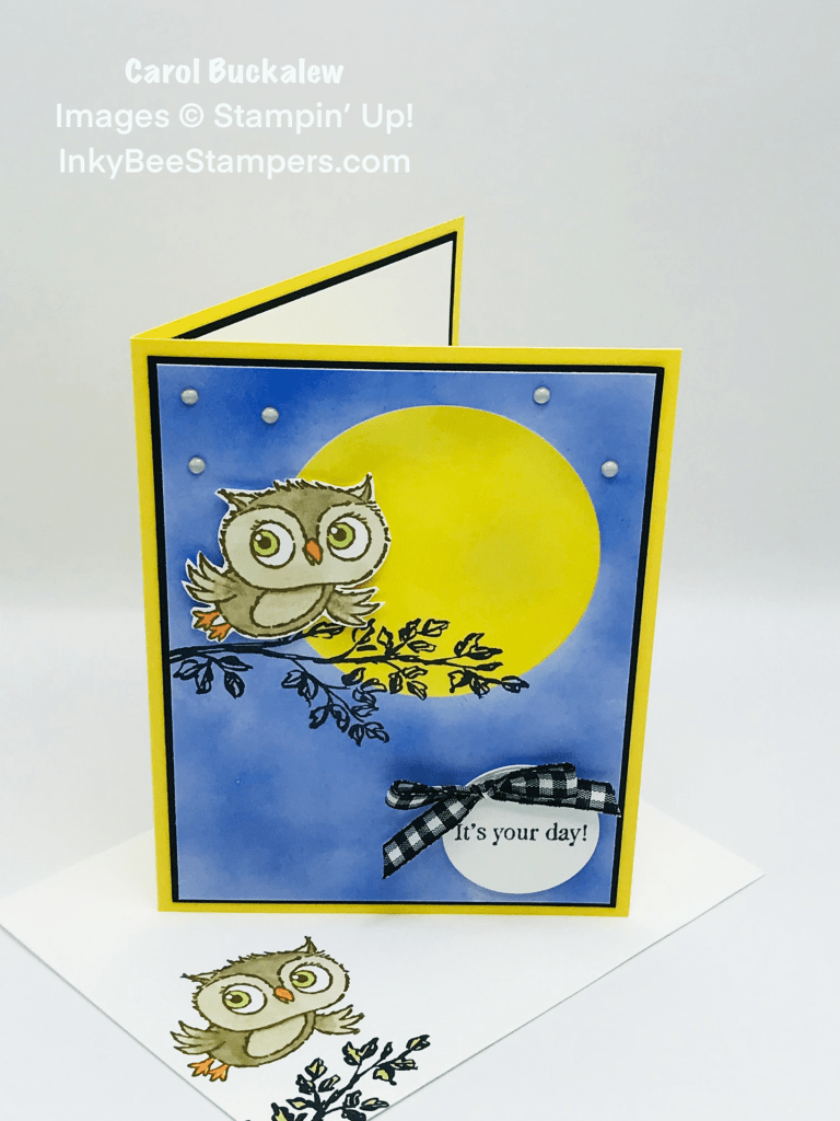 I used the Adorable Owls Stamp Set and the Garden Birdhouses Stamp Set along with some ink blending to create this fun birthday or celebration card. The owl on this card is flying in front of the moon! How fun!