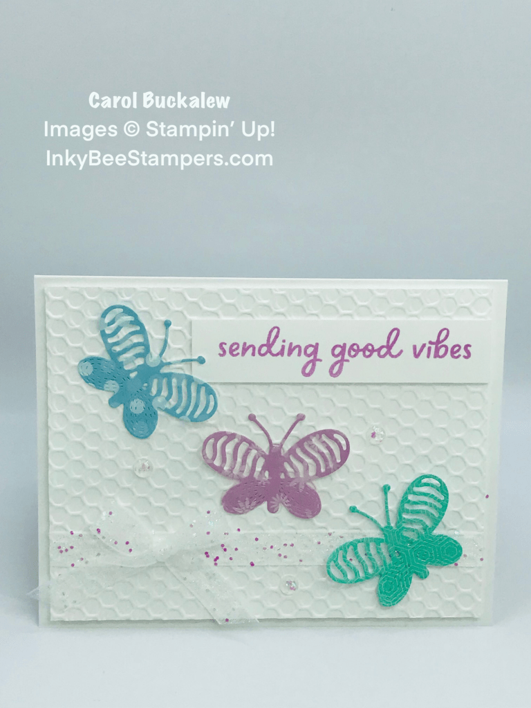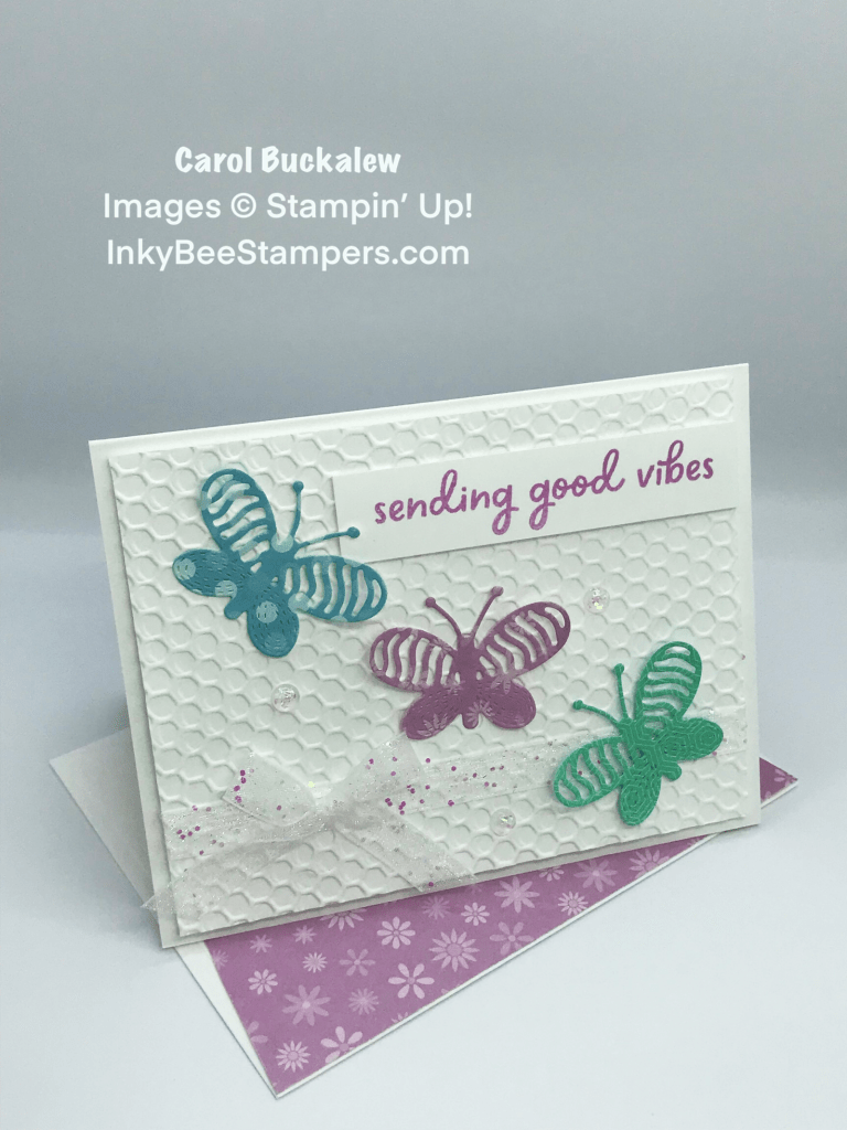 Happy Friday! This cheerful Any Occasion card was created using the Best Butterflies Bundle (stamps and dies), the Hive 3D Embossing Folder and the Dandy Designs 12″ x 12″ Designer Series Paper. You can earn the Hive 3D Embossing Folder and the Dandy Designs Designer Series Paper for free during Sale-a-bration with a qualifying order(s).