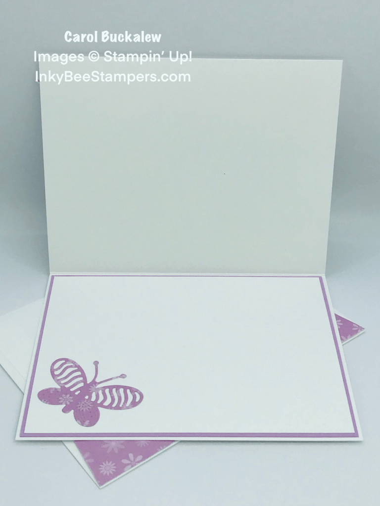 The fourth die cut butterfly was adhered to the inside panel. This panel was then matted to a piece of Fresh Freesia cardstock and this unit was adhered to the inside of the card.