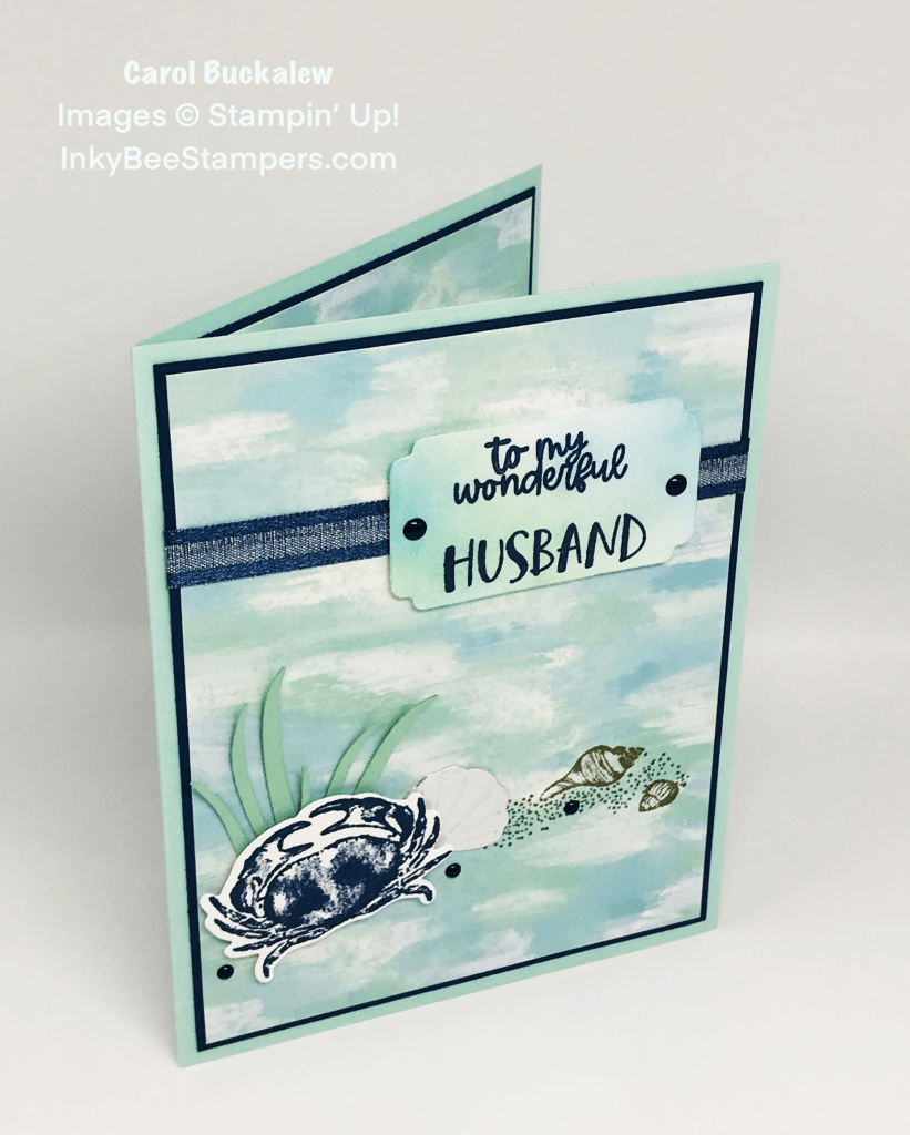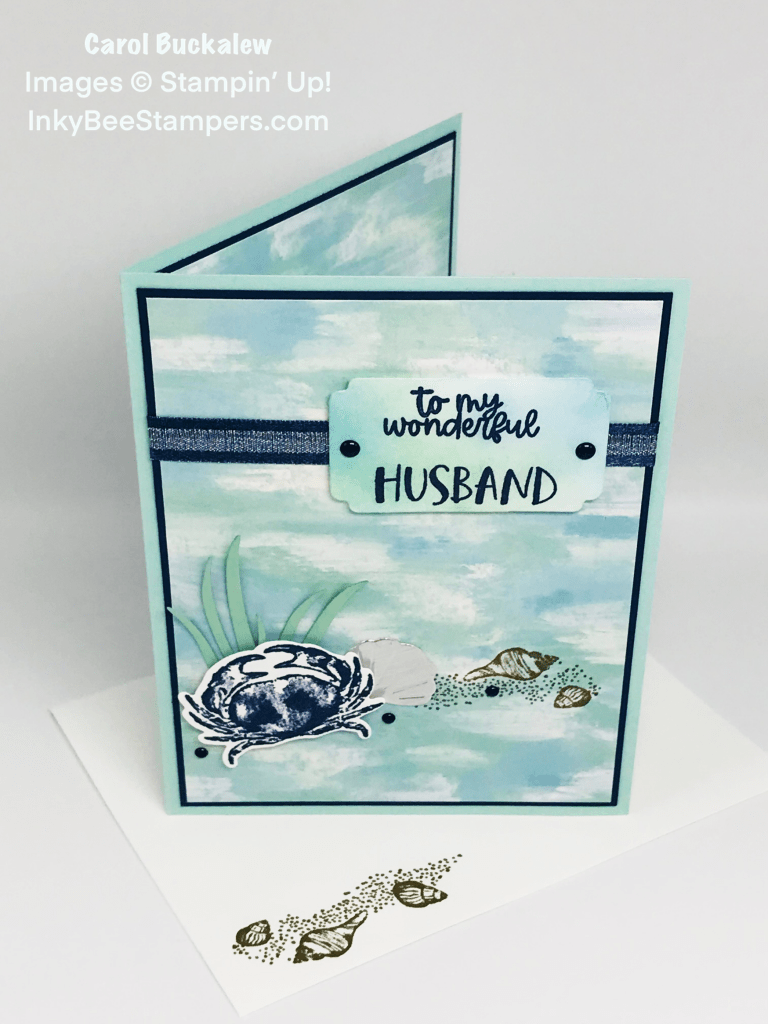 The image of sand and seashells from the Seaside Bay Stamp Set was stamped onto the lower portion of the panel in Soft Suede. I then stamped a crab in Night of Navy ink onto a piece of white cardstock and die cut it with the coordinating die from the Seaside Bay Dies set. Several grasses were die cut from Mint Macaron and a silver clam shell was die cut using dies from the same set. These elements were arranged onto the card front and the crab was adhered to the card front using Stampin’ Dimensionals.