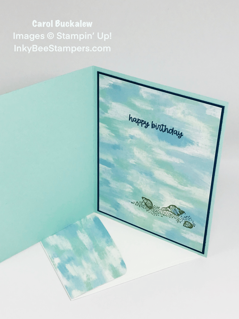 For the inside of the card, I used another panel from the same designer series paper as used for the front of the card and stamped the “happy birthday” sentiment in Night of Navy ink. The sand and seashell image were stamped on the lower portion of the panel in Soft Suede ink. I then adhered the panel to a mat in Night of Navy and adhered this unit to the inside of the card.