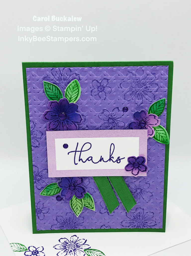 To start I second generation stamped the flower image from the Petal Park Stamp Set onto a Highland Heather panel using Gorgeous Grape ink. The Cane Weave 3D Embossing Folder was used to dry emboss the panel and then the panel was adhered to the front of a card base in Garden Green.