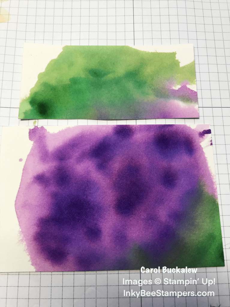Using clean water, I completely wet several pieces of Fluid 100 Watercolor Paper and dropped Gorgeous Grape ink onto one panel and Garden Green ink onto the other panel then used a Water Painter to spread the ink around on the paper surface. The color variations on the watercolor paper will provide an organic look to the flowers and leaves. The paper was allowed to fully dry before using the detailed flower and leaf stamps from the Petal Park Stamp Set to stamp onto the watercolored surfaces. The Petal Park Builder Punch was then used to punch out flowers and leaves. Below is what the watercolor paper looks like before stamping the detailed images and punching them out. It looks messy, I know, but it makes for some pretty flowers and leaves!