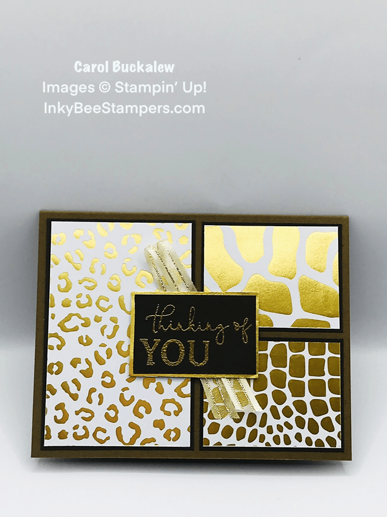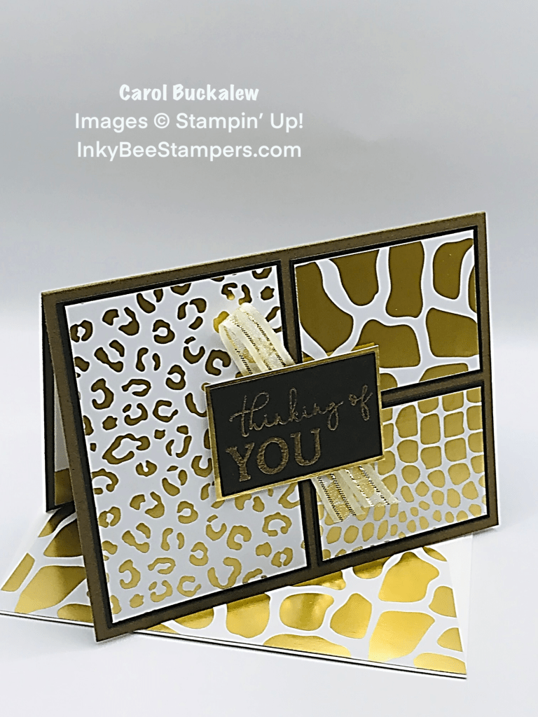 I chose three of the gold prints from the Like An Animal Specialty Designer Series Paper pack and cut the pieces down and matted them to Early Espresso cardstock. The panels were then adhered to the front of a Soft Suede card base.