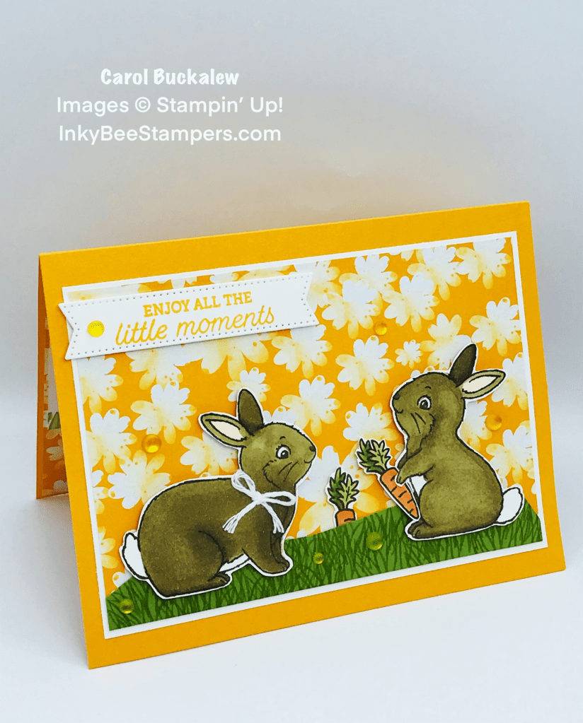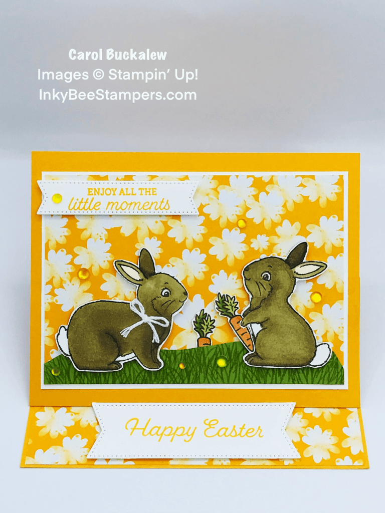 A panel of flowered paper from the Rain or Shine 12″ x 12″ Specialty Designer Series Paper was adhered to a mat in Basic White cardstock and this unit was then adhered to a 5-1/2″ x 4-1/4″ piece of Mango Melody cardstock. The hand cut “hill” was adhered to the bottom of this unit. I used my paper snips to cut between the paws of the sitting bunny and adhered one of the fussy cut carrots between the bunny’s paws. The bunnies were then adhered to this panel using Stampin’ Dimensionals and the second carrot was tucked behind the grass hill between the bunnies.