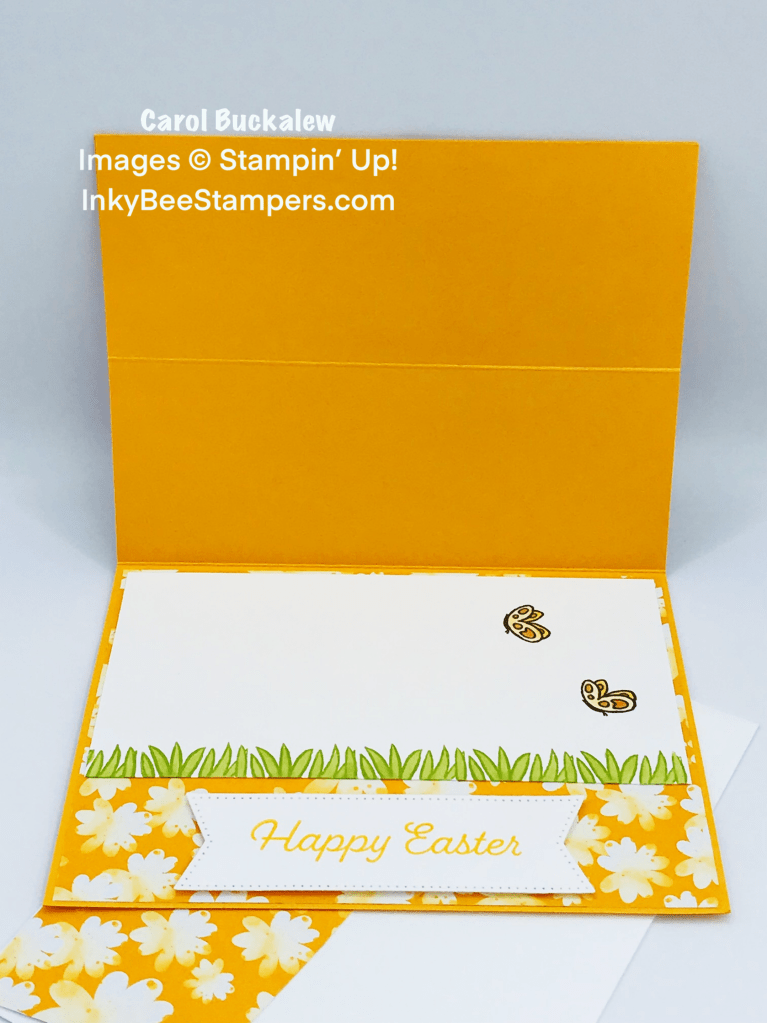 A panel of the same Rain or Shine Specialty Designer Series Paper flower print was adhered to the inside of the card. On a white panel measuring 2-3/4″ x 5-1/4″ I stamped grass along the bottom edge and used an Old Olive Stampin’ Blend to color in the blades of grass. Two butterflies were stamped on this panel and also colored with Stampin’ Blends in So Saffron and Pumpkin Pie. This white panel was adhered to the inside of the card towards the top.