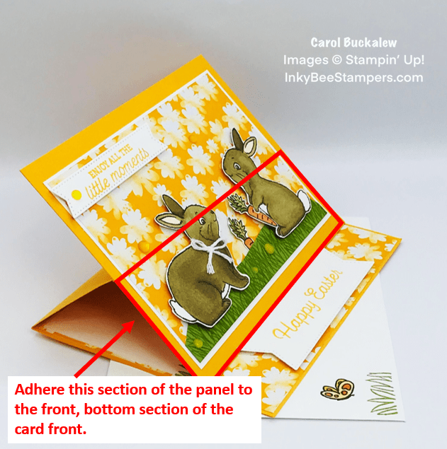 A card base measuring 8-1/2″ x 5-1/2″ was cut from Mango Melody cardstock and scored on the long edge at 2-1/8″ and 4-1/4″. The bottom of the decorated bunny panel was adhered to the front bottom of the card base.
