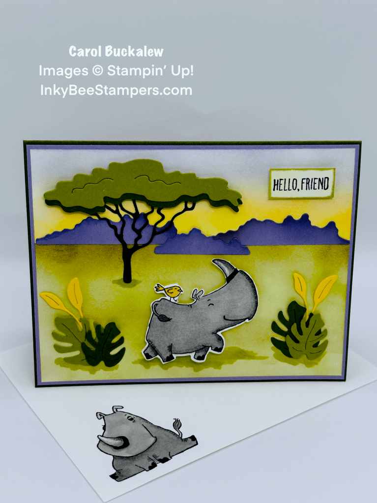 I started off by ink blending a Basic White panel to create a safari type landscape, complete with open plains, distant mountains and a Marula Tree (I had to google the name of the tree!). I also die cut a number of components using the Rhino Ready Dies. The image of our cute little Rhino and his bird friend was stamped using Tuxedo Black Memento ink and I used a variety of Stampin’ Blend colors to color in the image. All of the components were arranged onto the ink blended panel and adhered with either liquid glue or Stampin’ Dimensionals. This card uses quite a few inks and cardstock colors! If you don’t have the exact colors I used – use what you have and make it fun! If you would like to use the exact colors I used, I have all of the products listed at the bottom of this post for you.