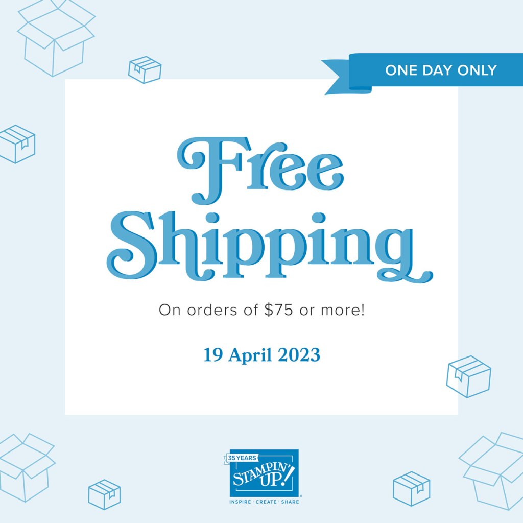 Stampin’ Up! is offering free shipping on all orders of $75 or greater today only – April 19. Have your shopping list ready? Here are the details: