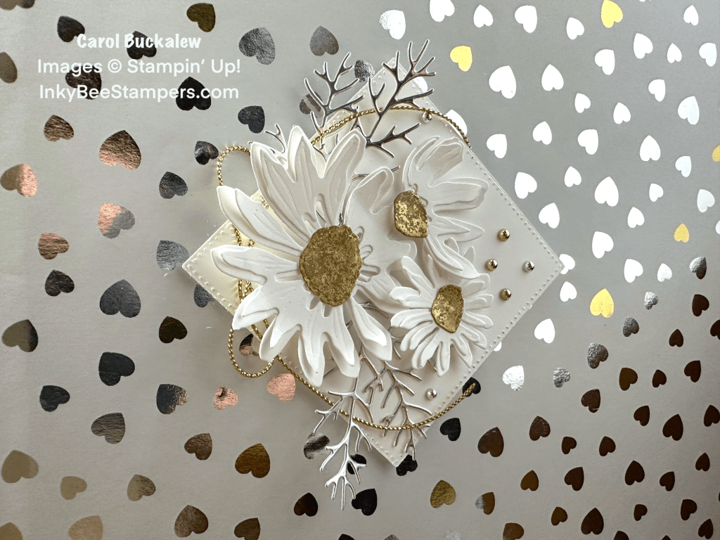 The daisies were adhered to the die cut square using Stampin’ Dimensionals. I tucked the silver leaf sprigs under the left and right side of the largest daisy. A bow was tied from Gold Trim and added above the large daisy. I left the bow ends long so that they would hang down on either side of the flowers. Multiple silver Festive Pearls were added around the flowers. The topper was adhered to the wrapped gift using Stampin’ Dimensionals since I thought it might be easier to remove by the recipient.