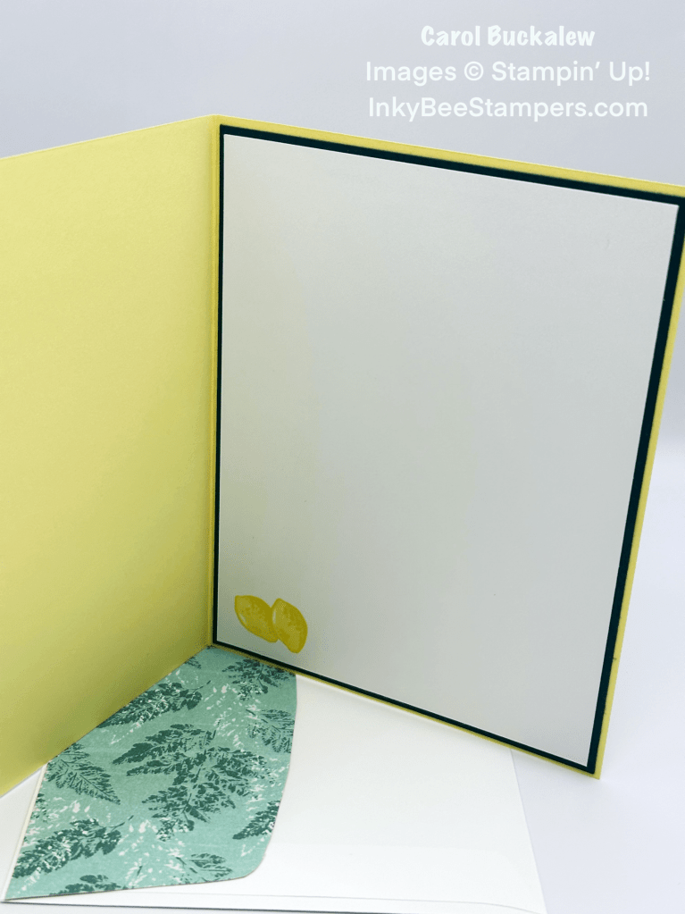I kept the inside panel simple and used the two step stamps to stamp the image of the lemons onto the lower corner using Lemon Lolly and Daffodil Delight ink. The panel was adhered to a mat in Pretty Peacock and then adhered to the inside of the card.