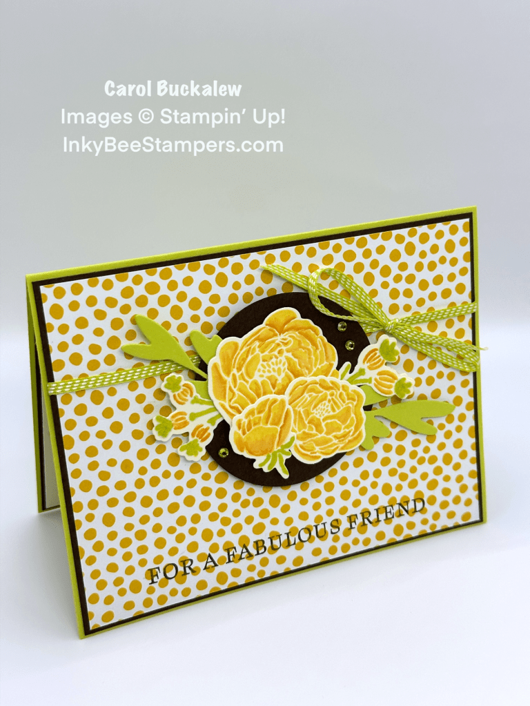 For the inside panel I stamped an additional sentiment in Early Espresso ink and the large flower image was stamped in Daffodil Delight ink, as well as a flower bud, onto the lower corner of the panel. I again used a Blender Pen to shade the flower petals with Pumpkin Pie ink and color the flower bud stem and top using a Lemon Lime Twist Stampin’ Blend. The panel was adhered to an Early Espresso mat and then adhered to the inside of the card.