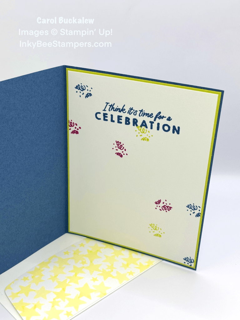 The small confetti image was stamped diagonally onto the inside panel using Misty Moonlight, Berry Burst and Lemon Lime Twist ink and an additional sentiment was added. The panel was then adhered to a Lemon Lime Twist mat and this unit was adhered to the inside of the card.