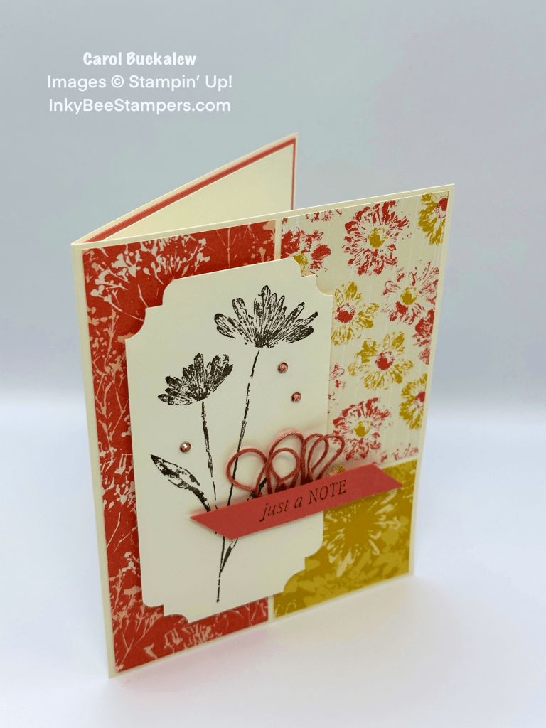 Using a length of Baker’s Twine I colored the twine using the dark shade of a Calypso Coral Stampin’ Blend. I applied a small amount of Stampin’ Seal to the stamped flower panel and looped the twine several times, adhering it to the area of Stampin’ Seal. The sentiment was stamped onto a 1/2″ piece of Calypso Coral cardstock using Early Espresso ink. I used the Very Best Trio Punch again to add slanted edges to the sentiment label and then adhered the label to the card front using a combination of glue and Stampin’ Dimensionals.