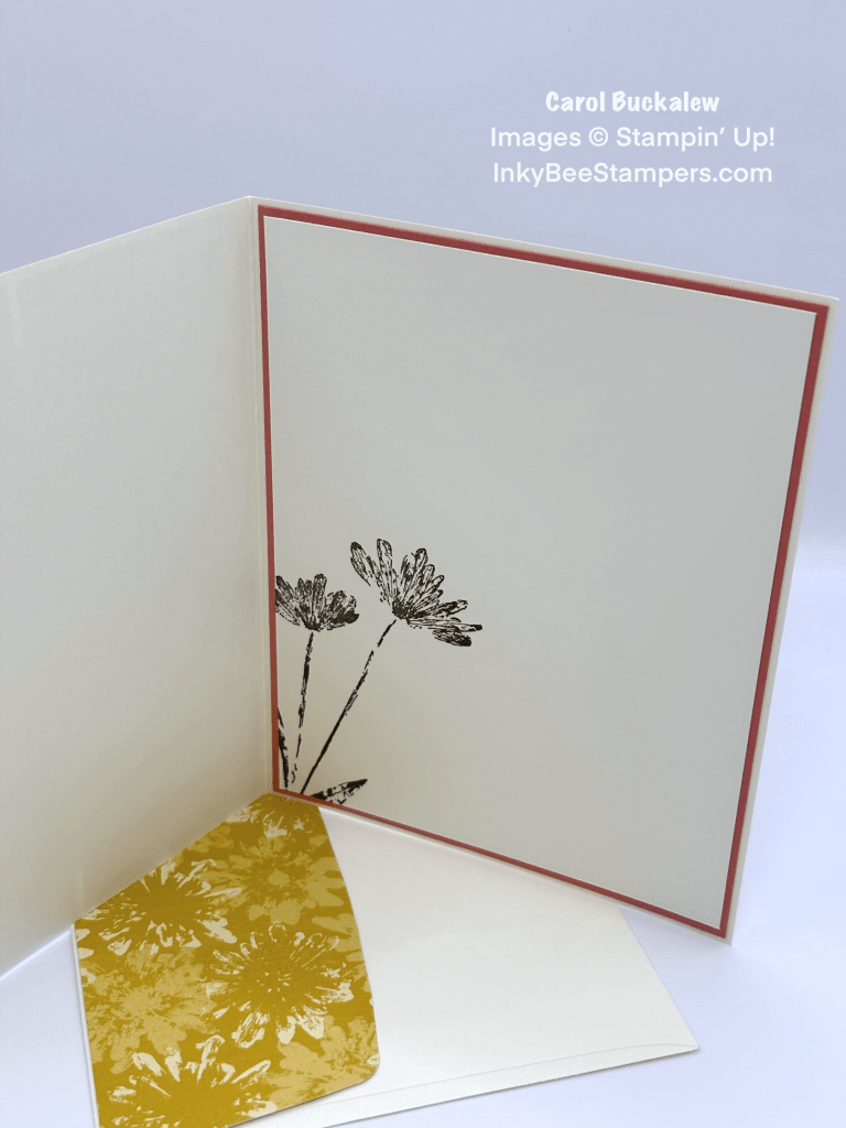 On the inside panel I partially stamped the large flower image from the Inked & Tiled Stamp Set and then adhered the panel to a mat in Calypso Coral. This unit was then adhered to the inside of the card.
