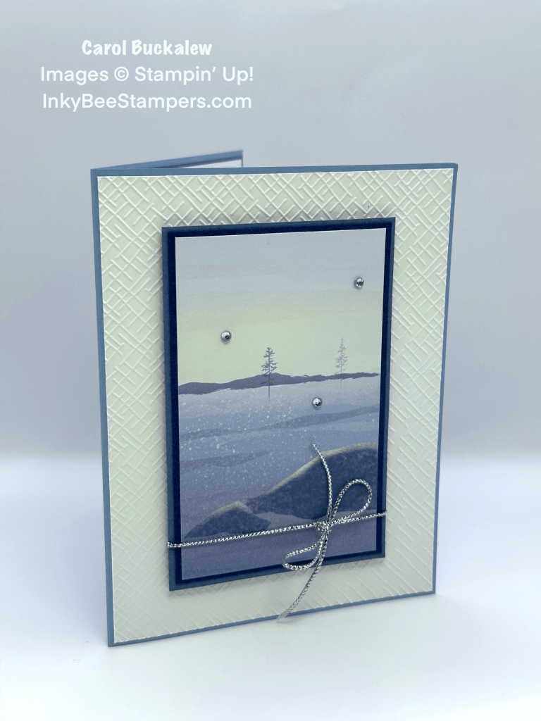 I started off by using the cross-hatch embossing folder from the Basics 3D Embossing Folders set to emboss a white panel which was adhered to a Boho Blue card base. I cut a scene from one of the papers in the One Horse Open Sleigh paper pack and double matted the panel with Night of Navy and Misty Moonlight. A length of silver trim was tied around the bottom of the panel and the panel was adhered to the center of the card front using Stampin’ Dimensionals.