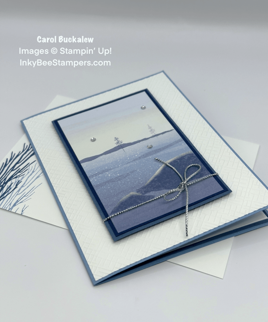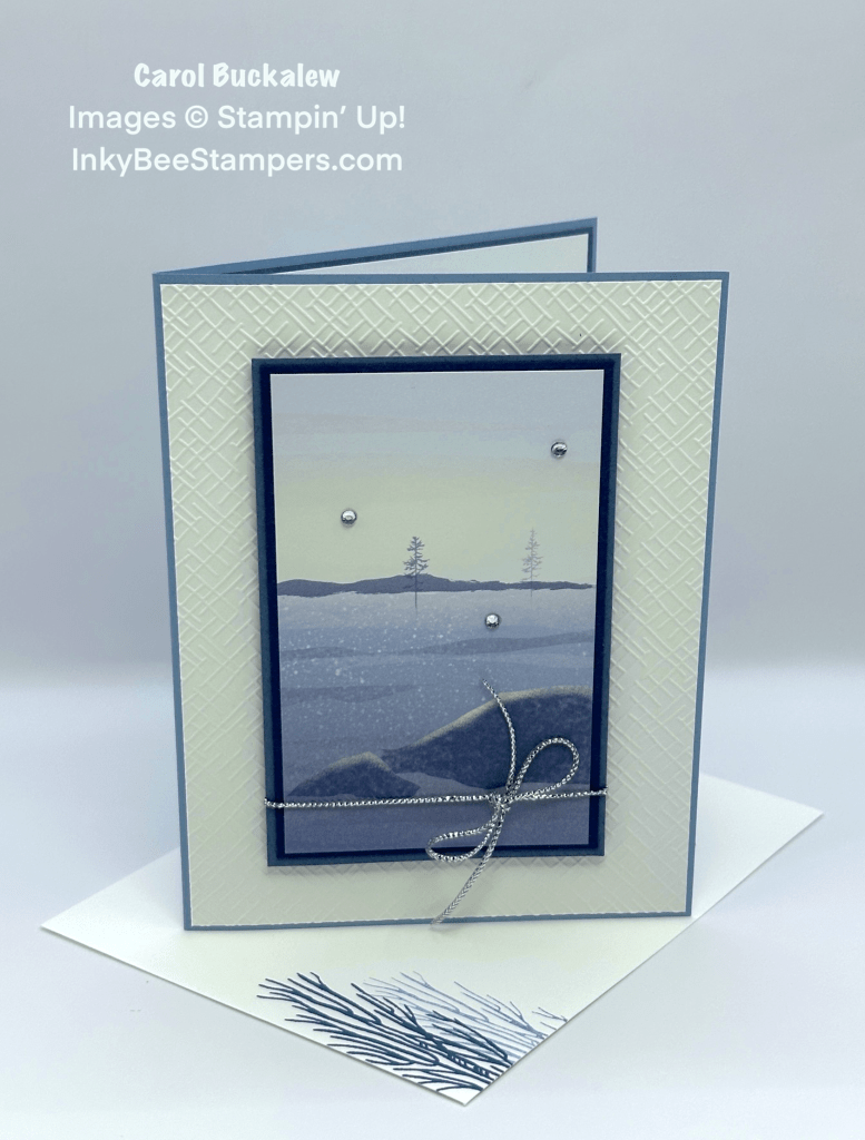 My card for today is a Christmas themed card. I know…it’s only July! But it’s not too early to start thinking about making those Christmas cards! Today’s card design is simple and easy and uses the lovely One Horse Open Sleigh 6″ x 6″ Designer Series Paper. The panel on the front of the card is double matted and tied with some pretty silver trim…perfect to send to your family or friends! And there are a ton of pretty winter scenes in the One Horse Open Sleigh Designer Series Paper pack to create multiples of this card!