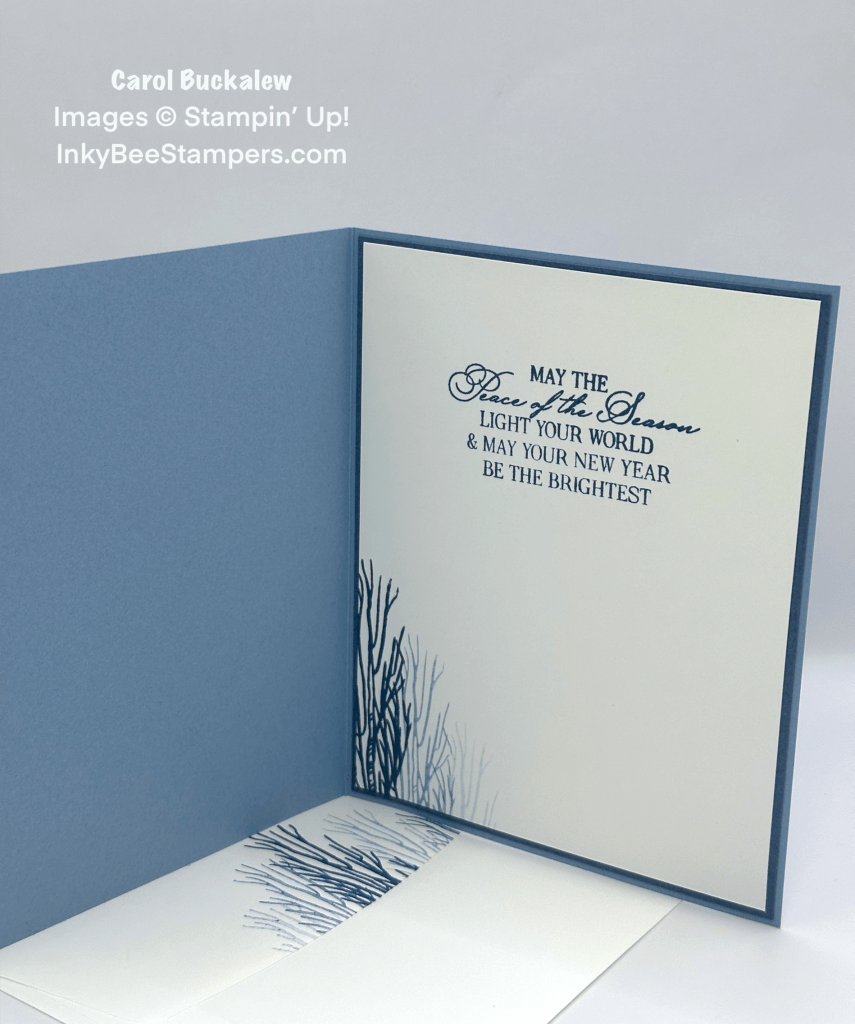 I chose a sentiment from the Brightest Glow Stamp Set and stamped this in Misty Moonlight ink onto the inside panel. I first, second and third generation stamped the image of the tree from the Horse & Sleigh Stamp Set onto the lower corner of the panel, then adhered the panel to a Misty Moonlight mat and adhered this unit to the inside of the card.