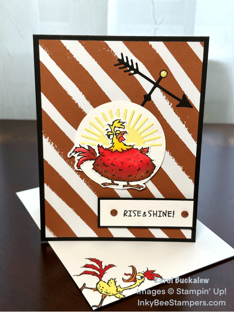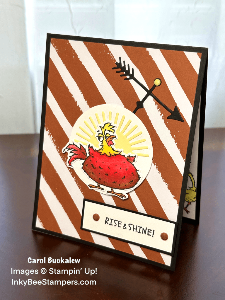 A piece of the 2023-2025 In Color 6″ x 6″ Designer Series Paper in a Copper Clay stripe was adhered to a Basic Black card base. The image of the “fluffy” rooster was stamped in Tuxedo Black Memento Ink onto a scrap of white cardstock. I used Lemon Lolly, Poppy Parade, Pumpkin Pie, and Copper Clay Stampin’ Blends to color in the image, then the image was cut out using the coordinating die from the set. Using the Hey Chuck Dies I cut out a weathervane from Basic Black cardstock and the sun in Lemon Lolly cardstock.