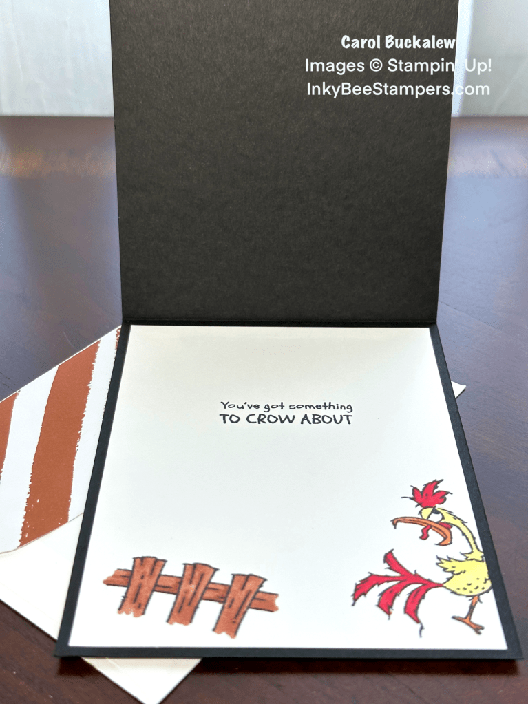 For the inside of the card, I stamped an additional sentiment. The fence image was stamped in the lower corner and another of the roosters was partially stamped onto the opposite corner. I used Copper Clay Stampin’ Blends to color in the fence and Lemon Lolly, Poppy Parade and Pumpkin Pie Stampin’ Blends to color in the rooster. This panel was then adhered to the inside of the card.